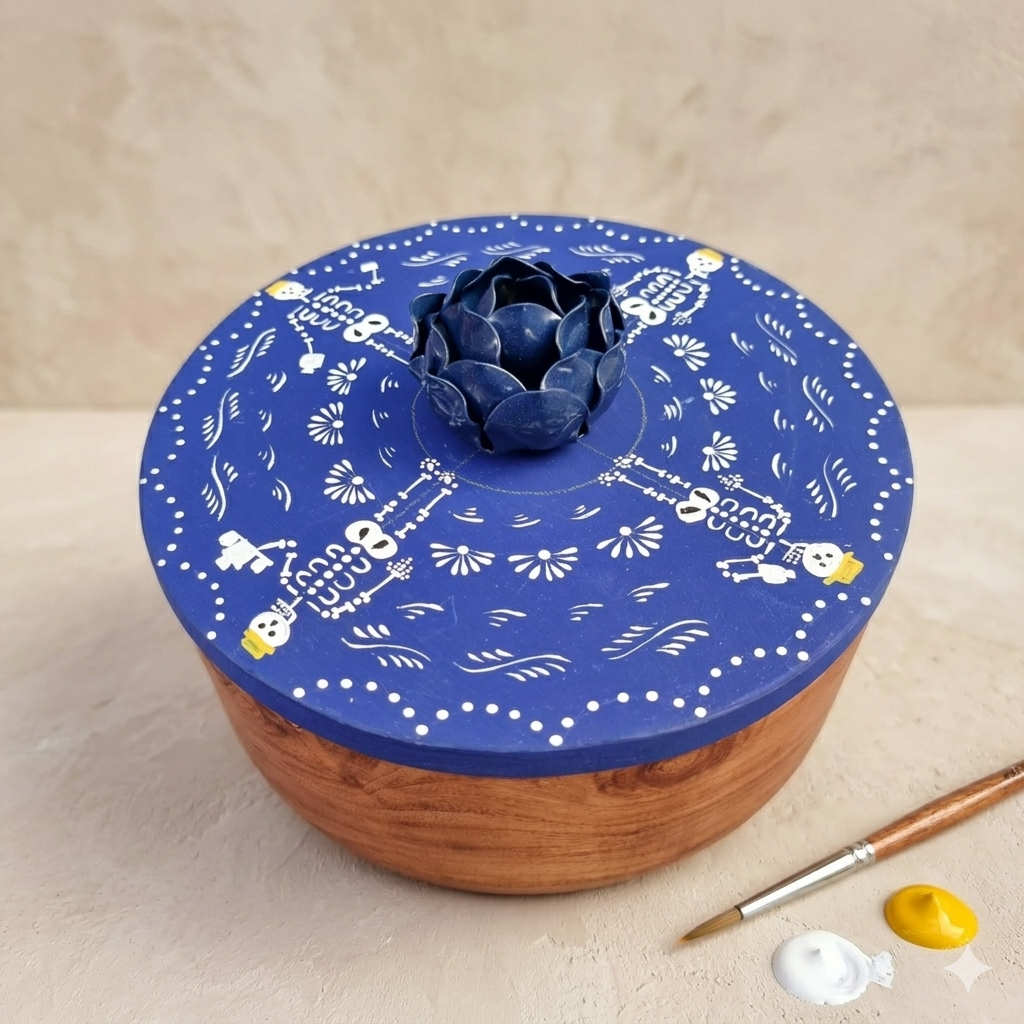 Piezas hechas de madera de guamúchil, cuya tapa es pintada a mano por artesanos michoacanos.